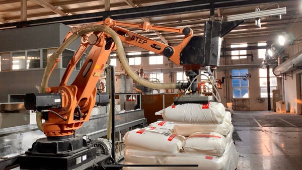 防排水板智能拆垛上料装备。该设备有针对性地设计了防排水板自动拆垛上料系统的软硬件组成,尤其是机器视觉、电控和机器人方面,完成了系统的部署及应用。在机器视觉识别精准性方面,料袋中心的平均定位误差不超过2.5cm。在运行速度方面,袋料的平均拆垛上料时间在50秒以内。